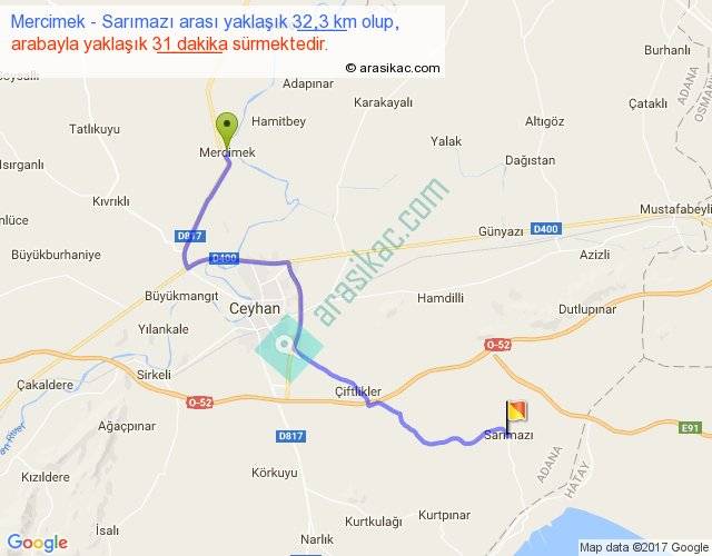 Mercimek - Sarımazı arası yaklaşık olarak 90 km/h ile yukarıda belirtilen sürede olup, iki yerin kuş uçuşu uzaklığı (mesafesi) 22'dir. Yolculuk otobüsle 40 dakika sürmektedir.