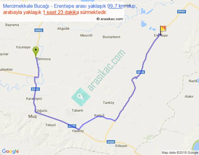 Mercimekkale Bucağı - Erentepe arası yaklaşık olarak 90 km/h ile yukarıda belirtilen sürede olup, iki yerin kuş uçuşu uzaklığı (mesafesi) 48'dir. Yolculuk otobüsle 1 saat 47 dakika sürmektedir.
