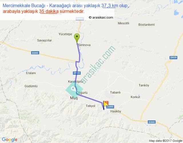 Mercimekkale Bucağı - Karaağaçlı arası yaklaşık olarak 90 km/h ile yukarıda belirtilen sürede olup, iki yerin kuş uçuşu uzaklığı (mesafesi) 29'dir. Yolculuk otobüsle 45 dakika sürmektedir.