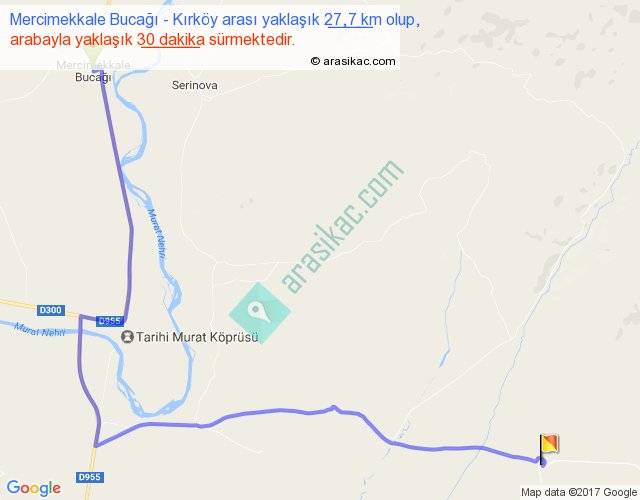 Mercimekkale Bucağı - Kırköy arası yaklaşık olarak 90 km/h ile yukarıda belirtilen sürede olup, iki yerin kuş uçuşu uzaklığı (mesafesi) 18'dir. Yolculuk otobüsle 39 dakika sürmektedir.