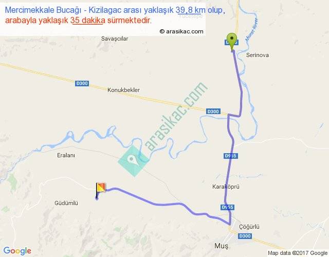 Mercimekkale Bucağı - Kizilagac arası yaklaşık olarak 90 km/h ile yukarıda belirtilen sürede olup, iki yerin kuş uçuşu uzaklığı (mesafesi) 23'dir. Yolculuk otobüsle 45 dakika sürmektedir.