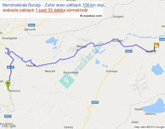 Mercimekkale Bucağı - Zafer arası yaklaşık olarak 90 km/h ile yukarıda belirtilen sürede olup, iki yerin kuş uçuşu uzaklığı (mesafesi) 70'dir. Yolculuk otobüsle 2 saat 0 dakika sürmektedir.