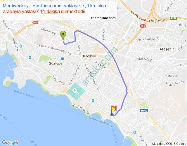 Merdivenköy - Bostancı arası yaklaşık olarak 90 km/h ile yukarıda belirtilen sürede olup, iki yerin kuş uçuşu uzaklığı (mesafesi) 4'dir. Yolculuk otobüsle 14 dakika sürmektedir.