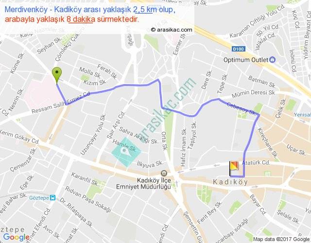 Merdivenköy - Kadiköy arası yaklaşık olarak 90 km/h ile yukarıda belirtilen sürede olup, iki yerin kuş uçuşu uzaklığı (mesafesi) 1'dir. Yolculuk otobüsle 10 dakika sürmektedir.