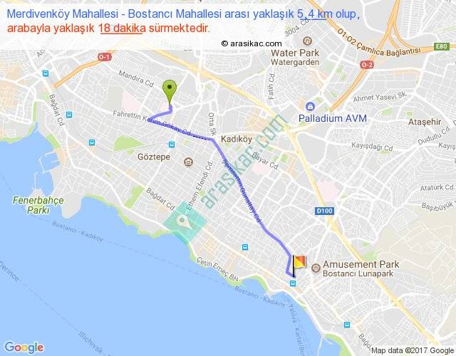Merdivenköy Mahallesi - Bostancı Mahallesi arası yaklaşık olarak 90 km/h ile yukarıda belirtilen sürede olup, iki yerin kuş uçuşu uzaklığı (mesafesi) 4'dir. Yolculuk otobüsle 23 dakika sürmektedir.