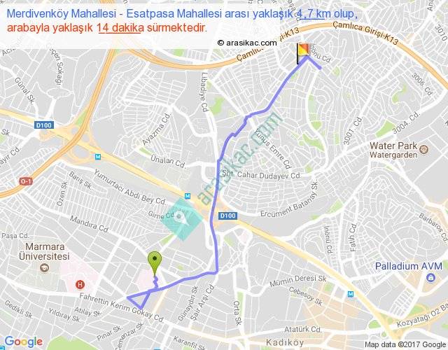 Merdivenköy Mahallesi - Esatpasa Mahallesi arası yaklaşık olarak 90 km/h ile yukarıda belirtilen sürede olup, iki yerin kuş uçuşu uzaklığı (mesafesi) 3'dir. Yolculuk otobüsle 18 dakika sürmektedir.