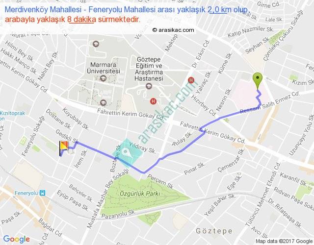 Merdivenköy Mahallesi - Feneryolu Mahallesi arası yaklaşık olarak 90 km/h ile yukarıda belirtilen sürede olup, iki yerin kuş uçuşu uzaklığı (mesafesi) 2'dir. Yolculuk otobüsle 10 dakika sürmektedir.