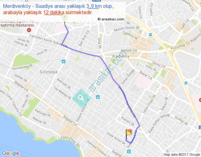 Merdivenköy - Suadiye arası yaklaşık olarak 90 km/h ile yukarıda belirtilen sürede olup, iki yerin kuş uçuşu uzaklığı (mesafesi) 3'dir. Yolculuk otobüsle 15 dakika sürmektedir.