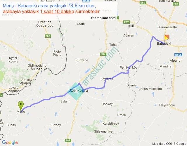 Meriç - Babaeski arası yaklaşık olarak 90 km/h ile yukarıda belirtilen sürede olup, iki yerin kuş uçuşu uzaklığı (mesafesi) 62'dir. Yolculuk otobüsle 1 saat 31 dakika sürmektedir.