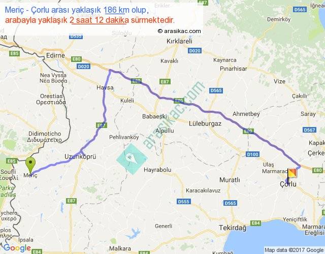 Meriç - Çorlu arası yaklaşık olarak 90 km/h ile yukarıda belirtilen sürede olup, iki yerin kuş uçuşu uzaklığı (mesafesi) 116'dir. Yolculuk otobüsle 2 saat 51 dakika sürmektedir.