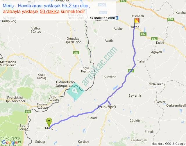 Meriç - Havsa arası yaklaşık olarak 90 km/h ile yukarıda belirtilen sürede olup, iki yerin kuş uçuşu uzaklığı (mesafesi) 52'dir. Yolculuk otobüsle 1 saat 5 dakika sürmektedir.