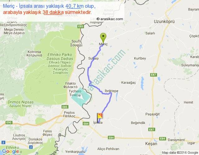 Meriç - İpsala arası yaklaşık olarak 90 km/h ile yukarıda belirtilen sürede olup, iki yerin kuş uçuşu uzaklığı (mesafesi) 29'dir. Yolculuk otobüsle 49 dakika sürmektedir.