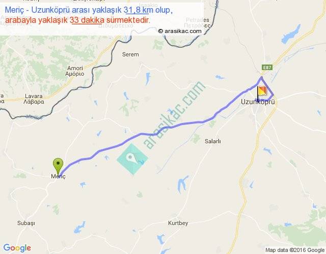 Meriç - Uzunköprü arası yaklaşık olarak 90 km/h ile yukarıda belirtilen sürede olup, iki yerin kuş uçuşu uzaklığı (mesafesi) 24'dir. Yolculuk otobüsle 42 dakika sürmektedir.
