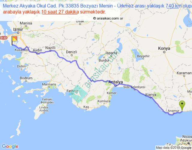 Merkez Akyaka Okul Cad. Pk:33835 Bozyazı Mersin - Ürkmez arası yaklaşık olarak 90 km/h ile yukarıda belirtilen sürede olup, iki yerin kuş uçuşu uzaklığı (mesafesi) 588'dir. Eğer belirtilen yerler arasında uçak seferi var ise bu süre uçakla 54 dakika'ya kadar düşebilir. Yolculuk otobüsle 13 saat 35 dakika sürmektedir.