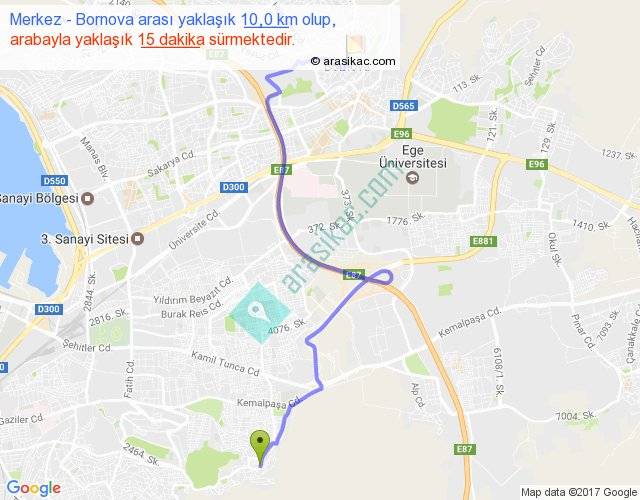 Merkez - Bornova arası yaklaşık olarak 90 km/h ile yukarıda belirtilen sürede olup, iki yerin kuş uçuşu uzaklığı (mesafesi) 6'dir. Yolculuk otobüsle 19 dakika sürmektedir.