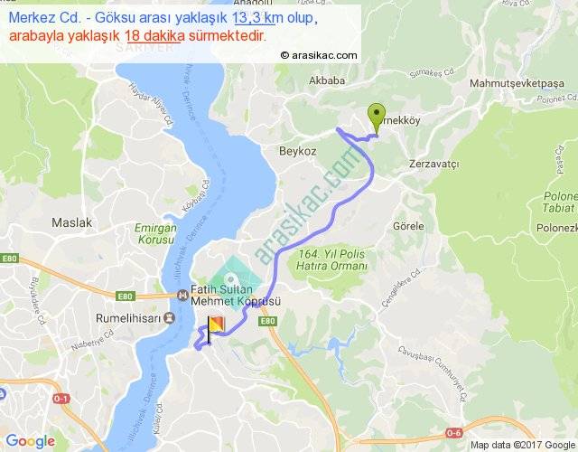 Merkez Cd. - Göksu arası yaklaşık olarak 90 km/h ile yukarıda belirtilen sürede olup, iki yerin kuş uçuşu uzaklığı (mesafesi) 8'dir. Yolculuk otobüsle 23 dakika sürmektedir.