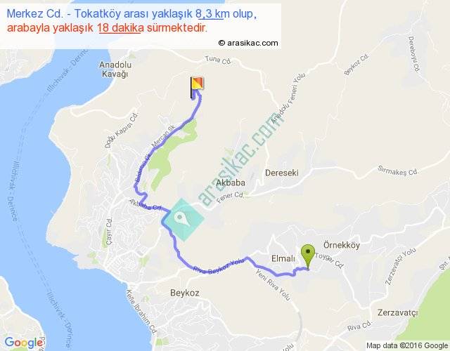 Merkez Cd. - Tokatköy arası yaklaşık olarak 90 km/h ile yukarıda belirtilen sürede olup, iki yerin kuş uçuşu uzaklığı (mesafesi) 4'dir. Yolculuk otobüsle 23 dakika sürmektedir.