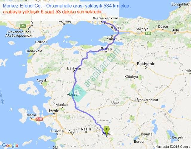 Merkez Efendi Cd. - Ortamahalle arası yaklaşık olarak 90 km/h ile yukarıda belirtilen sürede olup, iki yerin kuş uçuşu uzaklığı (mesafesi) 360'dir. Eğer belirtilen yerler arasında uçak seferi var ise bu süre uçakla 33 dakika'ya kadar düşebilir. Yolculuk otobüsle 8 saat 56 dakika sürmektedir.