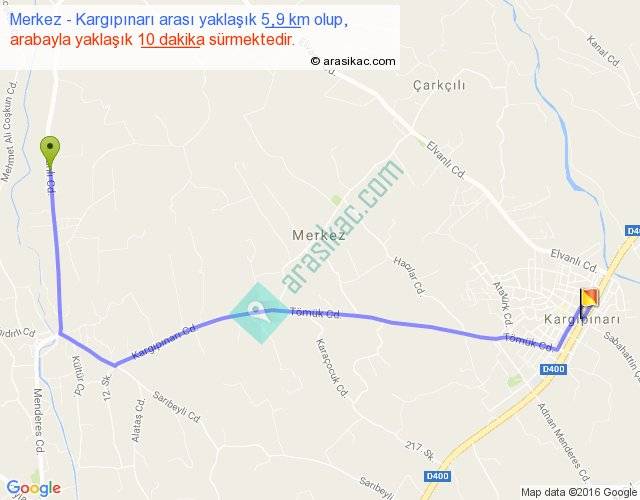 Merkez - Kargıpınarı arası yaklaşık olarak 90 km/h ile yukarıda belirtilen sürede olup, iki yerin kuş uçuşu uzaklığı (mesafesi) 4'dir. Yolculuk otobüsle 13 dakika sürmektedir.