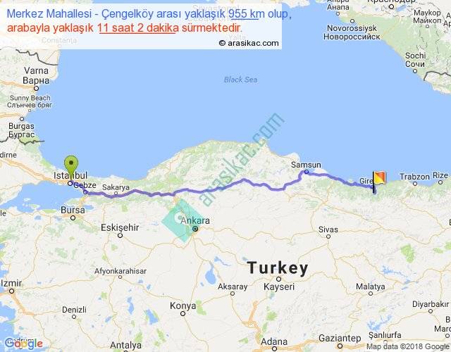 Merkez Mahallesi - Çengelköy arası yaklaşık olarak 90 km/h ile yukarıda belirtilen sürede olup, iki yerin kuş uçuşu uzaklığı (mesafesi) 790'dir. Eğer belirtilen yerler arasında uçak seferi var ise bu süre uçakla 1 saat 12 dakika'ya kadar düşebilir. Yolculuk otobüsle 14 saat 20 dakika sürmektedir.