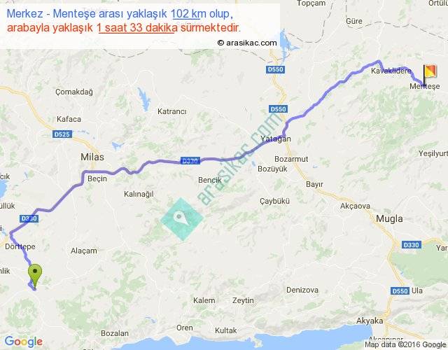 Merkez - Menteşe arası yaklaşık olarak 90 km/h ile yukarıda belirtilen sürede olup, iki yerin kuş uçuşu uzaklığı (mesafesi) 76'dir. Yolculuk otobüsle 2 saat 0 dakika sürmektedir.