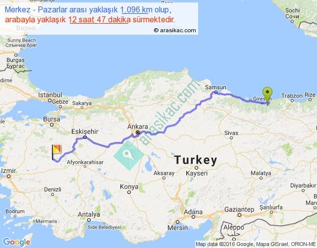 Merkez - Pazarlar arası yaklaşık olarak 90 km/h ile yukarıda belirtilen sürede olup, iki yerin kuş uçuşu uzaklığı (mesafesi) 831'dir. Eğer belirtilen yerler arasında uçak seferi var ise bu süre uçakla 1 saat 16 dakika'ya kadar düşebilir. Yolculuk otobüsle 16 saat 37 dakika sürmektedir.
