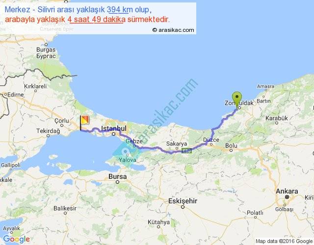 Merkez - Silivri arası yaklaşık olarak 90 km/h ile yukarıda belirtilen sürede olup, iki yerin kuş uçuşu uzaklığı (mesafesi) 293'dir. Eğer belirtilen yerler arasında uçak seferi var ise bu süre uçakla 27 dakika'ya kadar düşebilir. Yolculuk otobüsle 6 saat 15 dakika sürmektedir.