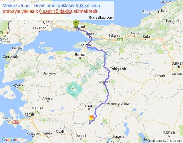 Merkezefendi - Bekilli arası yaklaşık olarak 90 km/h ile yukarıda belirtilen sürede olup, iki yerin kuş uçuşu uzaklığı (mesafesi) 311'dir. Eğer belirtilen yerler arasında uçak seferi var ise bu süre uçakla 28 dakika'ya kadar düşebilir. Yolculuk otobüsle 8 saat 7 dakika sürmektedir.