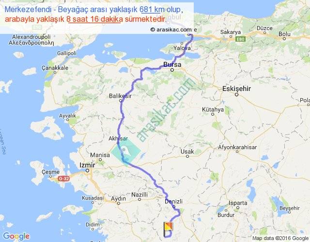 Merkezefendi - Beyağaç arası yaklaşık olarak 90 km/h ile yukarıda belirtilen sürede olup, iki yerin kuş uçuşu uzaklığı (mesafesi) 418'dir. Eğer belirtilen yerler arasında uçak seferi var ise bu süre uçakla 38 dakika'ya kadar düşebilir. Yolculuk otobüsle 10 saat 44 dakika sürmektedir.