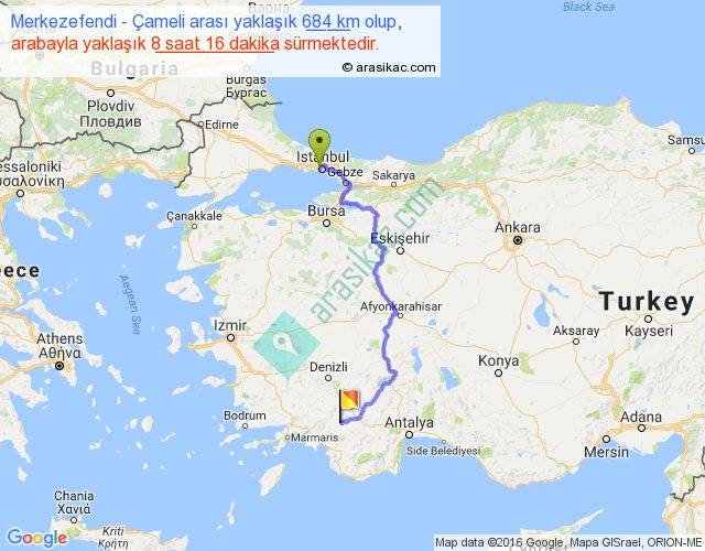 Merkezefendi - Çameli arası yaklaşık olarak 90 km/h ile yukarıda belirtilen sürede olup, iki yerin kuş uçuşu uzaklığı (mesafesi) 437'dir. Eğer belirtilen yerler arasında uçak seferi var ise bu süre uçakla 40 dakika'ya kadar düşebilir. Yolculuk otobüsle 10 saat 44 dakika sürmektedir.