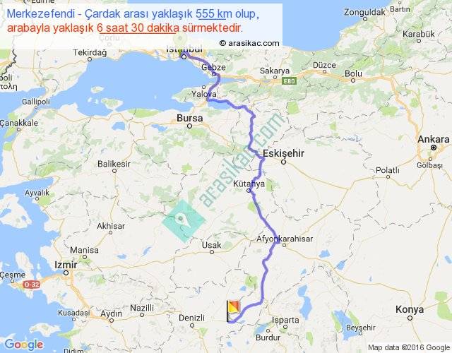 Merkezefendi - Çardak arası yaklaşık olarak 90 km/h ile yukarıda belirtilen sürede olup, iki yerin kuş uçuşu uzaklığı (mesafesi) 358'dir. Eğer belirtilen yerler arasında uçak seferi var ise bu süre uçakla 33 dakika'ya kadar düşebilir. Yolculuk otobüsle 8 saat 27 dakika sürmektedir.