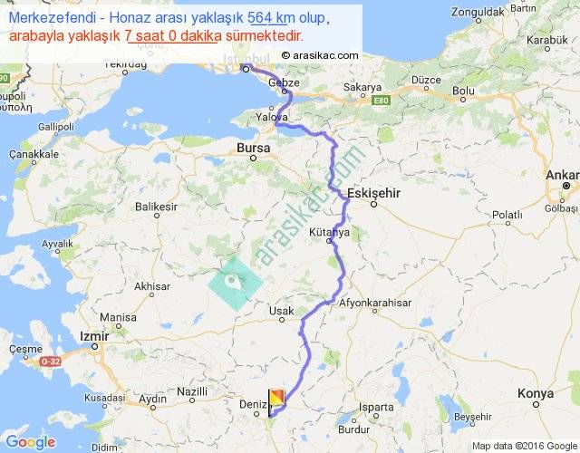 Merkezefendi - Honaz arası yaklaşık olarak 90 km/h ile yukarıda belirtilen sürede olup, iki yerin kuş uçuşu uzaklığı (mesafesi) 361'dir. Eğer belirtilen yerler arasında uçak seferi var ise bu süre uçakla 33 dakika'ya kadar düşebilir. Yolculuk otobüsle 9 saat 6 dakika sürmektedir.