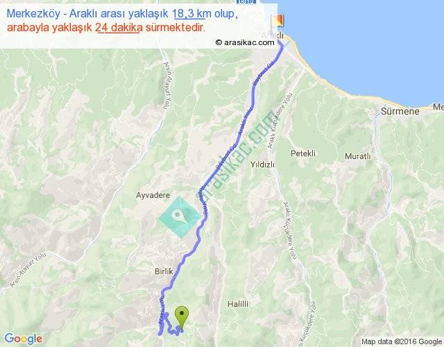 Merkezköy - Araklı arası yaklaşık olarak 90 km/h ile yukarıda belirtilen sürede olup, iki yerin kuş uçuşu uzaklığı (mesafesi) 13'dir. Yolculuk otobüsle 31 dakika sürmektedir.