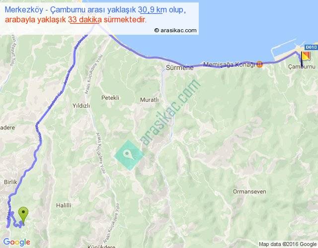 Merkezköy - Çamburnu arası yaklaşık olarak 90 km/h ile yukarıda belirtilen sürede olup, iki yerin kuş uçuşu uzaklığı (mesafesi) 18'dir. Yolculuk otobüsle 42 dakika sürmektedir.