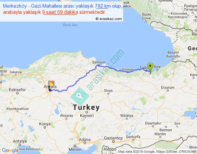 Merkezköy - Gazi Mahallesi arası yaklaşık olarak 90 km/h ile yukarıda belirtilen sürede olup, iki yerin kuş uçuşu uzaklığı (mesafesi) 615'dir. Eğer belirtilen yerler arasında uçak seferi var ise bu süre uçakla 56 dakika'ya kadar düşebilir. Yolculuk otobüsle 12 saat 58 dakika sürmektedir.