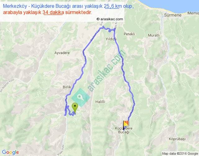 Merkezköy - Küçükdere Bucağı arası yaklaşık olarak 90 km/h ile yukarıda belirtilen sürede olup, iki yerin kuş uçuşu uzaklığı (mesafesi) 5'dir. Yolculuk otobüsle 44 dakika sürmektedir.