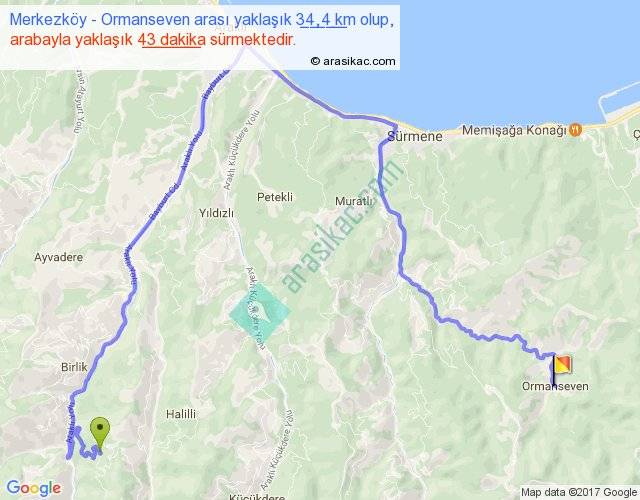 Merkezköy - Ormanseven arası yaklaşık olarak 90 km/h ile yukarıda belirtilen sürede olup, iki yerin kuş uçuşu uzaklığı (mesafesi) 13'dir. Yolculuk otobüsle 55 dakika sürmektedir.