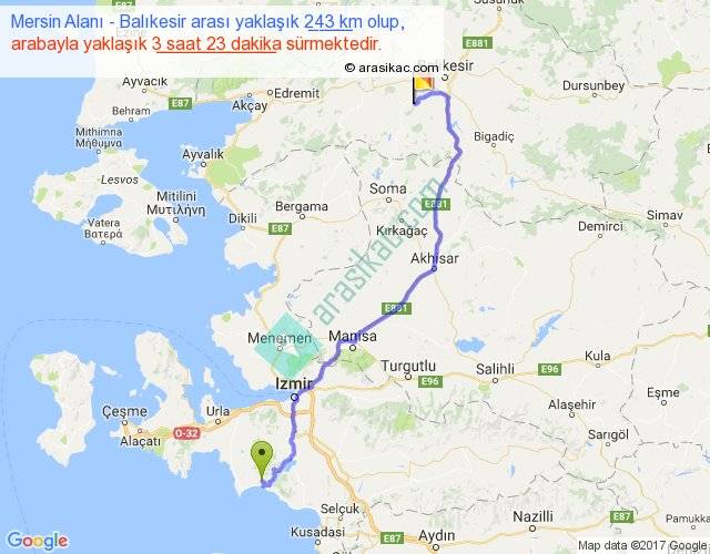Mersin Alanı - Balıkesir arası yaklaşık olarak 90 km/h ile yukarıda belirtilen sürede olup, iki yerin kuş uçuşu uzaklığı (mesafesi) 174'dir. Yolculuk otobüsle 4 saat 23 dakika sürmektedir.