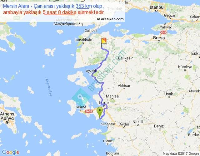 Mersin Alanı - Çan arası yaklaşık olarak 90 km/h ile yukarıda belirtilen sürede olup, iki yerin kuş uçuşu uzaklığı (mesafesi) 214'dir. Yolculuk otobüsle 6 saat 40 dakika sürmektedir.