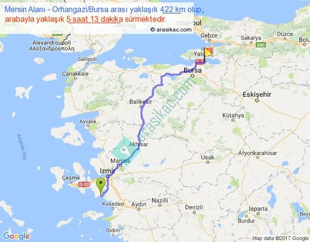 Mersin Alanı - Orhangazi Bursa arası yaklaşık olarak 90 km/h ile yukarıda belirtilen sürede olup, iki yerin kuş uçuşu uzaklığı (mesafesi) 328'dir. Eğer belirtilen yerler arasında uçak seferi var ise bu süre uçakla 30 dakika'ya kadar düşebilir. Yolculuk otobüsle 6 saat 46 dakika sürmektedir.