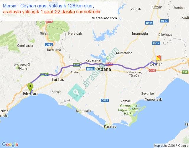 Mersin - Ceyhan arası yaklaşık olarak 90 km/h ile yukarıda belirtilen sürede olup, iki yerin kuş uçuşu uzaklığı (mesafesi) 106'dir. Yolculuk otobüsle 1 saat 46 dakika sürmektedir.