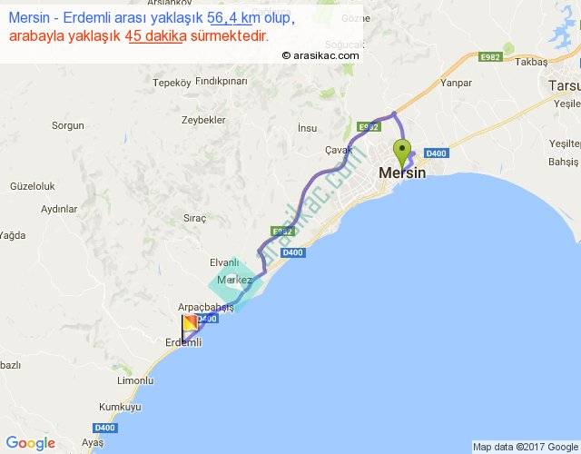 Mersin - Erdemli arası yaklaşık olarak 90 km/h ile yukarıda belirtilen sürede olup, iki yerin kuş uçuşu uzaklığı (mesafesi) 37'dir. Yolculuk otobüsle 1 saat 1 dakika sürmektedir.