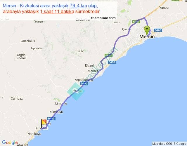 Mersin - Kızkalesi arası yaklaşık olarak 90 km/h ile yukarıda belirtilen sürede olup, iki yerin kuş uçuşu uzaklığı (mesafesi) 58'dir. Yolculuk otobüsle 1 saat 27 dakika sürmektedir.