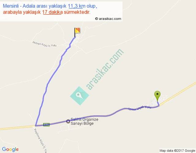Mersinli - Adala arası yaklaşık olarak 90 km/h ile yukarıda belirtilen sürede olup, iki yerin kuş uçuşu uzaklığı (mesafesi) 5'dir. Yolculuk otobüsle 22 dakika sürmektedir.