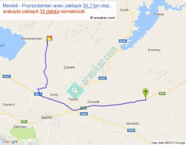 Mersinli - Poyrazdamları arası yaklaşık olarak 90 km/h ile yukarıda belirtilen sürede olup, iki yerin kuş uçuşu uzaklığı (mesafesi) 23'dir. Yolculuk otobüsle 42 dakika sürmektedir.
