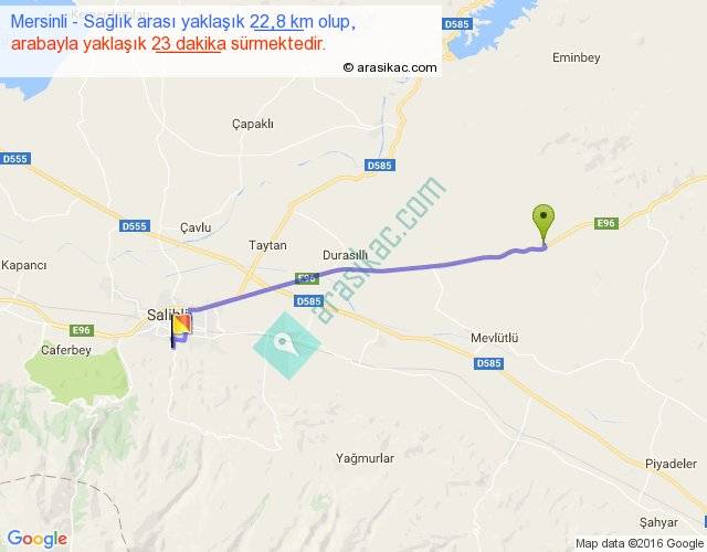Mersinli - Sağlık arası yaklaşık olarak 90 km/h ile yukarıda belirtilen sürede olup, iki yerin kuş uçuşu uzaklığı (mesafesi) 21'dir. Yolculuk otobüsle 29 dakika sürmektedir.