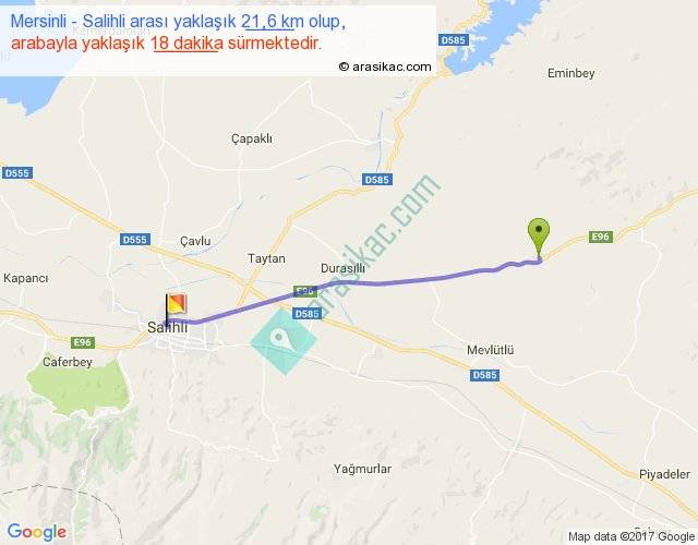 Mersinli - Salihli arası yaklaşık olarak 90 km/h ile yukarıda belirtilen sürede olup, iki yerin kuş uçuşu uzaklığı (mesafesi) 21'dir. Yolculuk otobüsle 23 dakika sürmektedir.