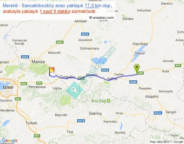 Mersinli - Sancaklıbozköy arası yaklaşık olarak 90 km/h ile yukarıda belirtilen sürede olup, iki yerin kuş uçuşu uzaklığı (mesafesi) 72'dir. Yolculuk otobüsle 1 saat 29 dakika sürmektedir.