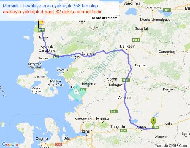 Mersinli - Tevfikiye arası yaklaşık olarak 90 km/h ile yukarıda belirtilen sürede olup, iki yerin kuş uçuşu uzaklığı (mesafesi) 241'dir. Yolculuk otobüsle 5 saat 53 dakika sürmektedir.
