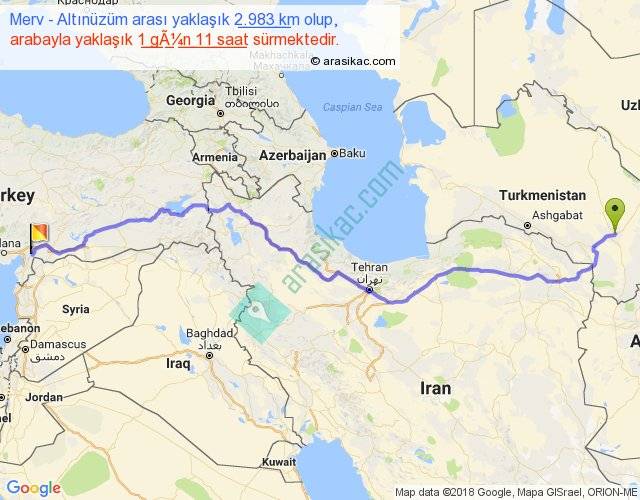 Merv - Altınüzüm arası yaklaşık olarak 90 km/h ile yukarıda belirtilen sürede olup, iki yerin kuş uçuşu uzaklığı (mesafesi) 2246'dir. Eğer belirtilen yerler arasında uçak seferi var ise bu süre uçakla 3 saat 27 dakika'ya kadar düşebilir. Yolculuk otobüsle 1 gün 21 saat sürmektedir.